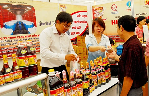 Muốn chiếm lĩnh thị trường lâu dài thì phải có thương hiệu quốc gia, sản phẩm danh tiếng. Trong ảnh: Nước mắm Phú Quốc tại hội chợ hàng Việt Nam chất lượng cao. Ảnh: HTD