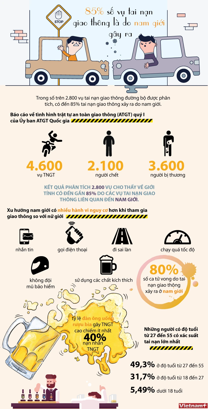 Trong số trên 2.800 vụ tai nạn giao thông đường bộ được phân tích, có đến 85% tai nạn giao thông xảy ra do nam giới.