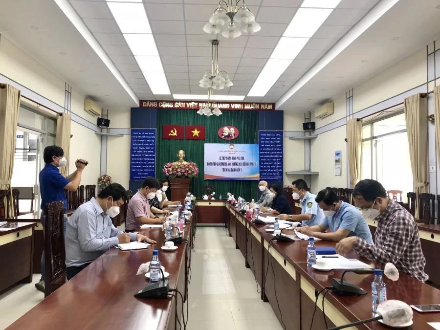 Tổ công tác đặc biệt phía Nam của Bộ Công Thương làm việc về công tác chống dịch, công tác đảm bảo an sinh xã hội tại quận 5, TP.HCM. Ảnh: BCT
