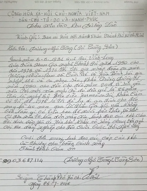 Lá đơn xin vào Viện Dưỡng lão của nghệ sĩ Tòng Sơn.