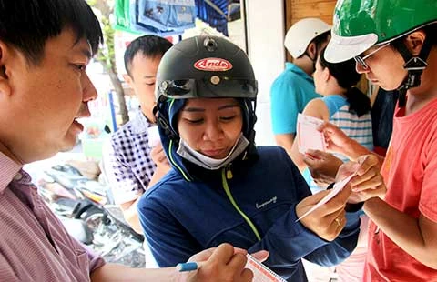 Trưa 20-7, điểm bán vé số Mega 6/45 ở 173 Thành Thái, quận 10, TP.HCM đông nghịt khách. Dù nhân viên bán vé số cho biết đang bị cúp điện nên không thể in vé số được nhưng người mua vẫn cứ lấy thẻ, chọn số, ghi thông tin của mình ở mặt sau thẻ này và trả tiền.