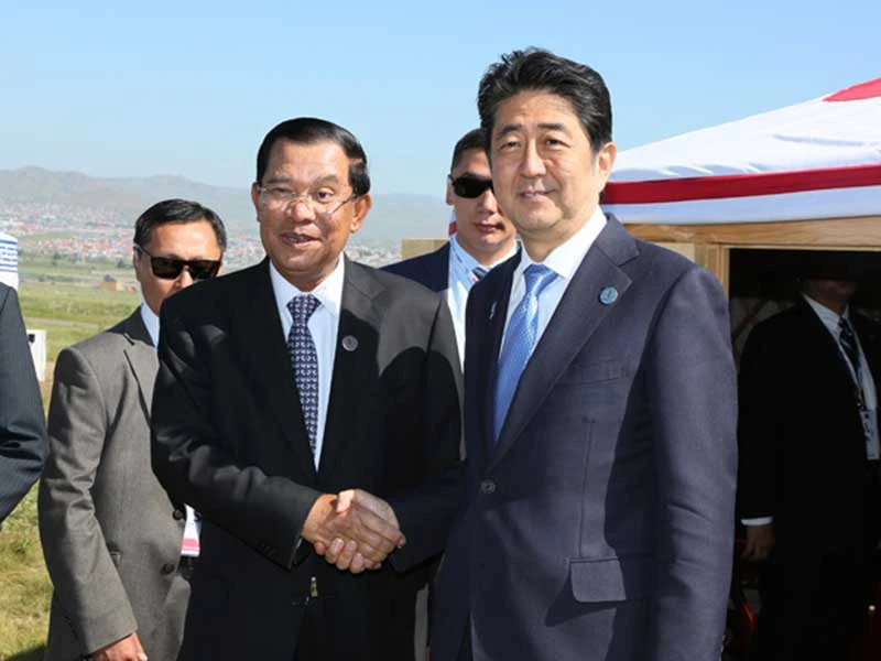 Thủ tướng Nhật Shinzo Abe (phải)và Thủ tướng Campuchia Hun Sen bên lề Hội nghị thượng đỉnh Á-Âu (ASEM) tháng 7-2016 ở Mông Cổ. Ảnh: MOFA