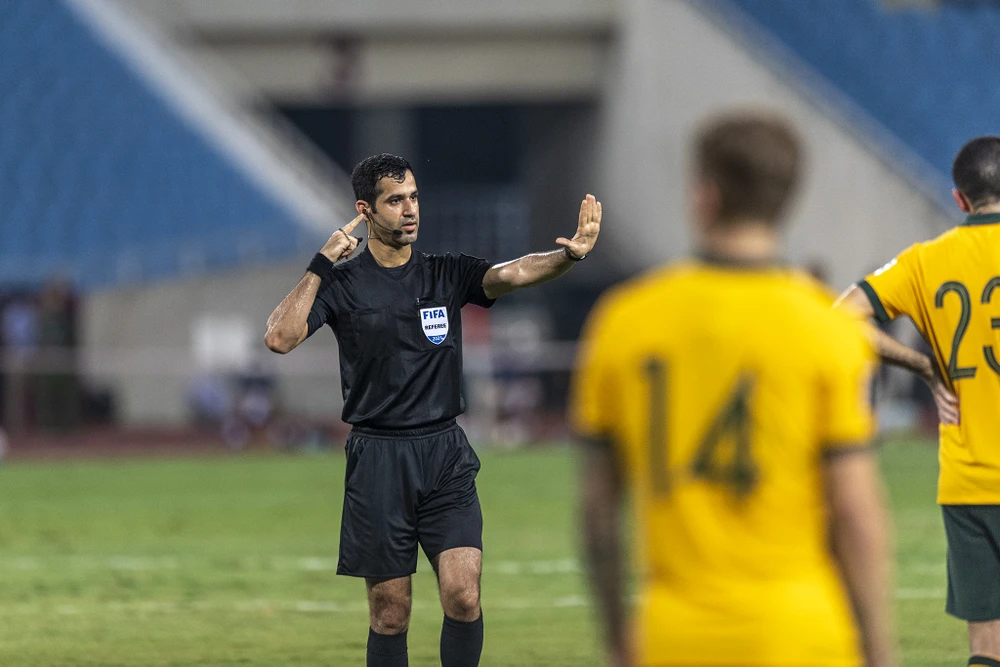 Trọng tài người Qatar sau khi tham khảo VAR vẫn quyết định không cho đội tuyển Việt Nam hưởng quả phạt đền chính đáng. Ảnh: HOÀNG HẢI THỊNH.