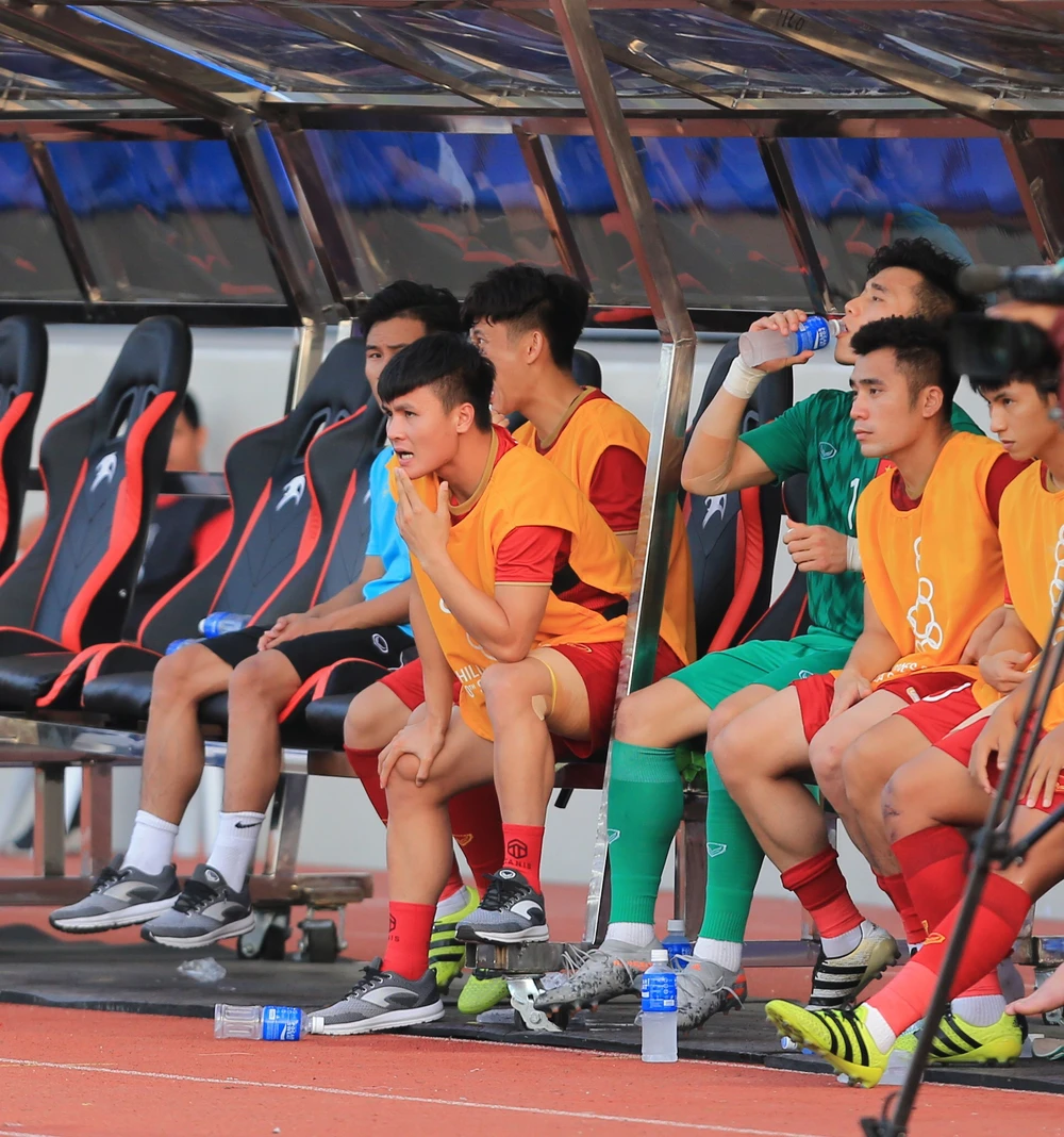 Quang Hải ngồi buồn thiu xem đồng đội thi đấu trên sân. Ảnh: NGỌC DUNG