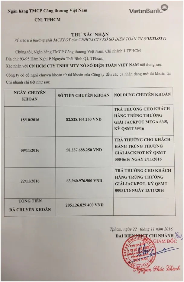 Thư xác nhận trả thưởng giải Jackpot qua chuyển khoản từ ngân hàng. Ảnh: TĐ