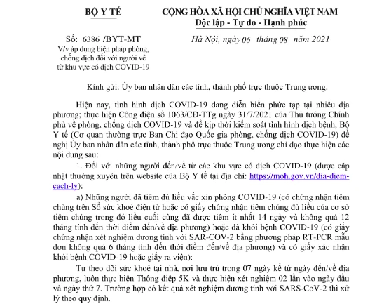 Việc ban hành công văn quy định như trên có sự khác biệt với quy định của Bộ Y tế tại Công văn số 6386/BYT-MT. Bộ Y tế quy định, những trường hợp trên tự theo dõi sức khoẻ tại nhà, nơi lưu trú trong bảy ngày kể từ ngày đến/về địa phương, luôn thực hiện 5K và xét nghiệm hai lần. Trường hợp có kết quả xét nghiệm dương tính với SARS-CoV-2 thì xử lý theo quy định.