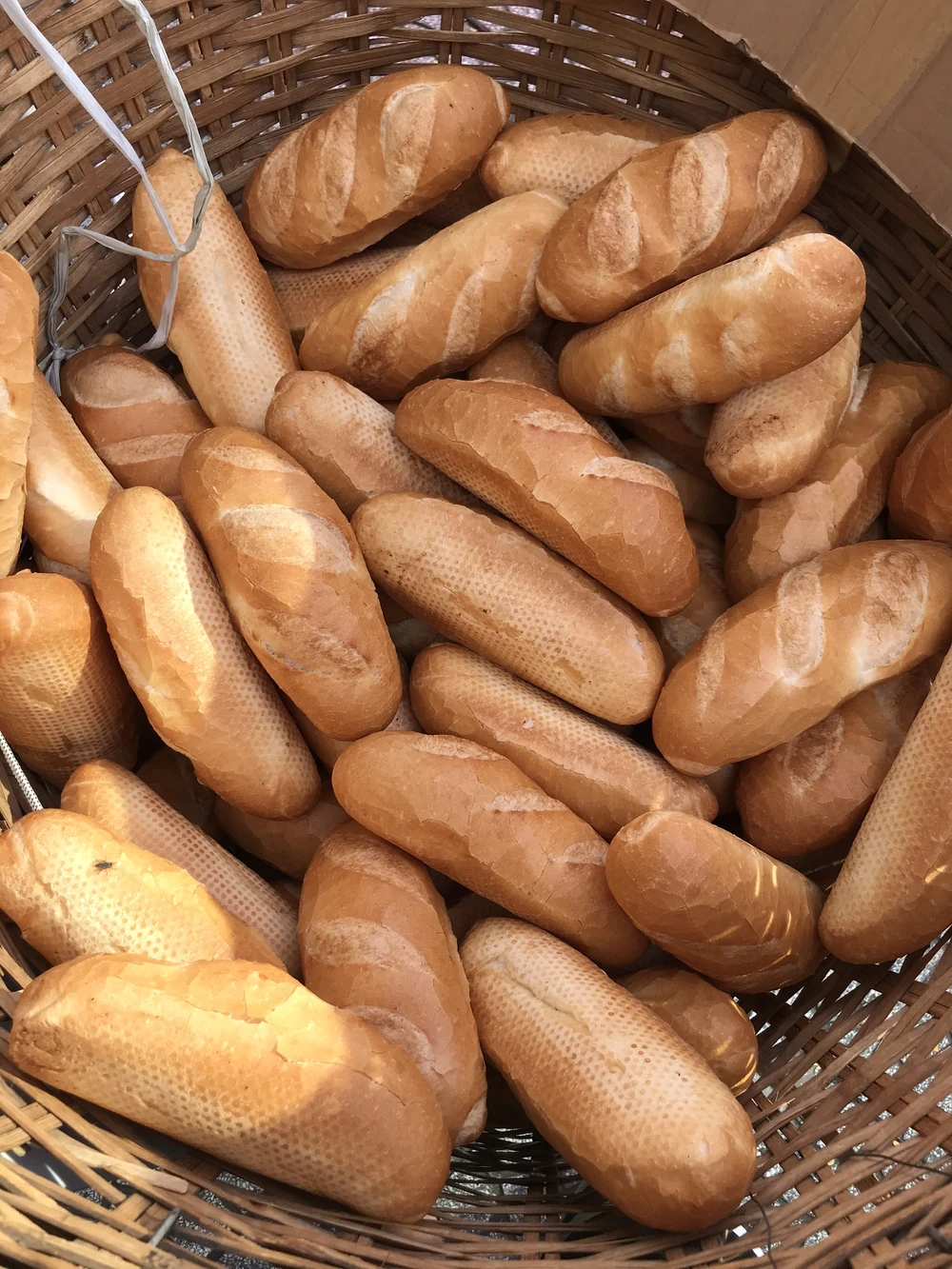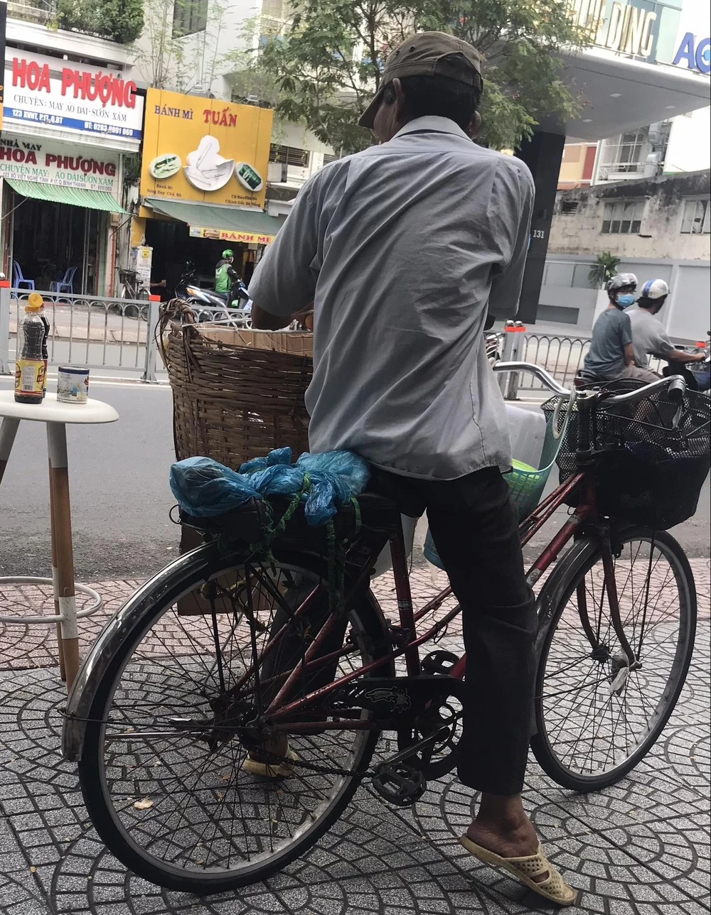 Ông Tư chạy xe ôm thường ở đây đón khách. Ông kể chuyện sọt bánh mì đó có từ hồi đợt dịch COVID-19 bùng lại, đâu cũng hơn 4 tháng rồi. Những ổ bánh mì vàng ươm, giòn tan, nóng hôi hổi là bữa sáng quen thuộc của ông và hàng trăm người khác.