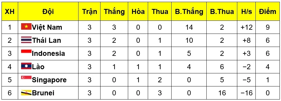 Sau ba vòng đấu ở bảng B, thầy trò Park Hang-seo toàn thắng và dẫn đầu với 9 điểm (hiệu số bàn thắng bại 14/2). Lần lượt xếp sau là Thái Lan 6 điểm (hiệu số 10/2), Indonesia 6 điểm (hiệu số 5/2), Lào 3 điểm (hiệu số 4/6), Singapore 1 điểm (hiệu số 0/5), Brunei 0 điểm (hiệu số 0/16).