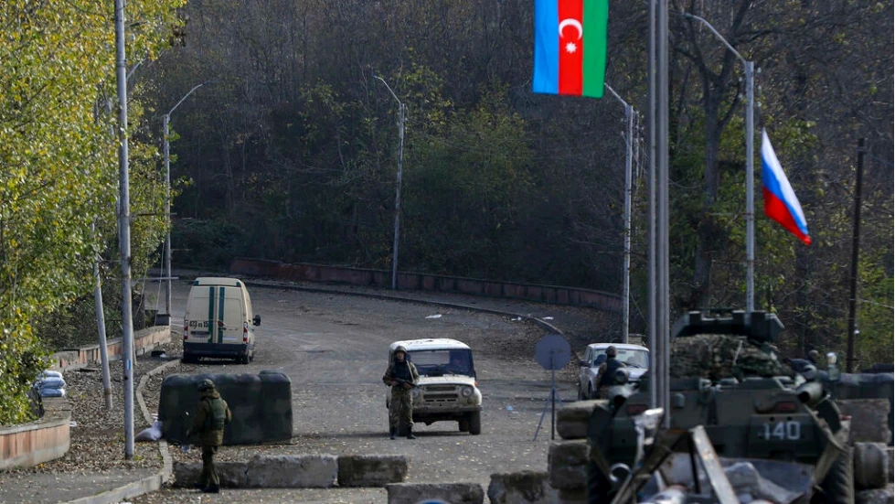 Binh sĩ Azerbaijan (giữa) và lực lượng gìn giữ hòa bình Nga tại một chốt kiểm soát ở khu vực ly khai Nagorno-Karabakh, ngày 27-11-2020. Ảnh: AP