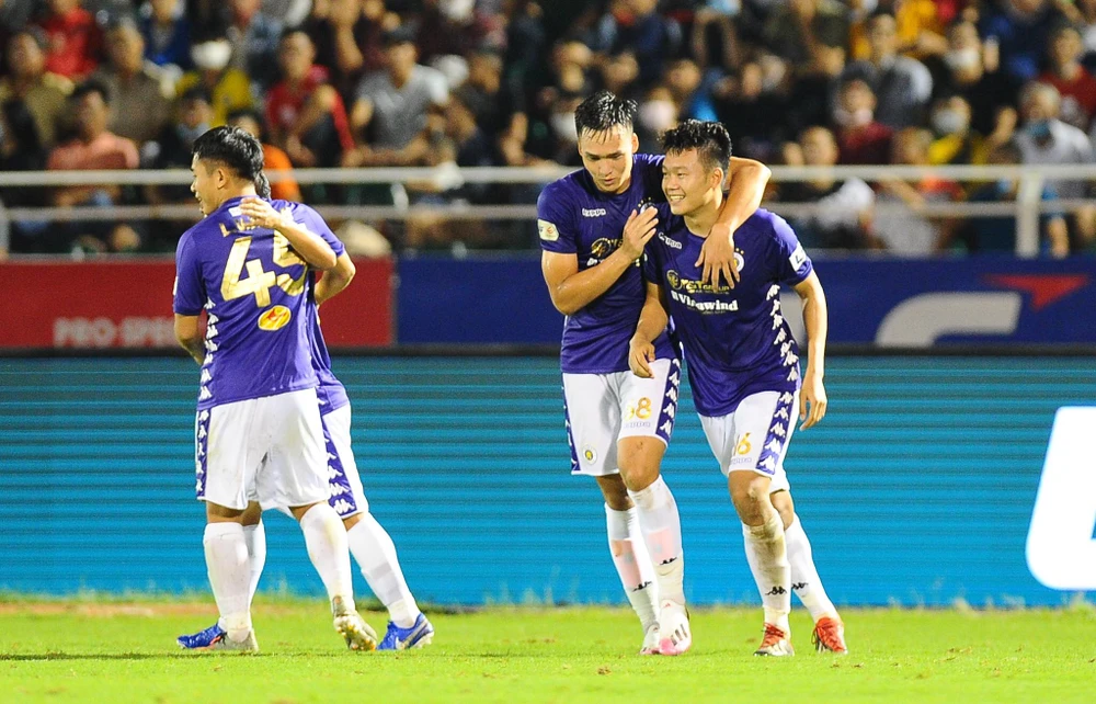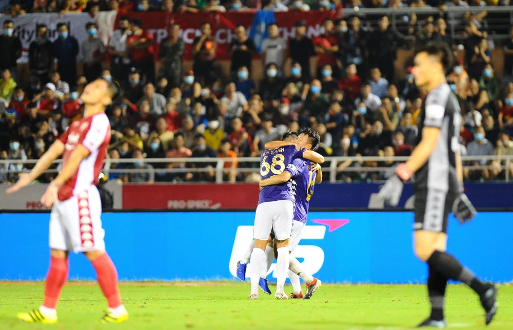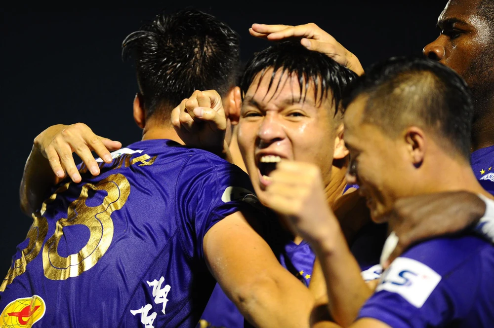 Cầu thủ Hà Nội hạnh phúc với bàn mở điểm ở phút 72 vào lưới đồng đội cũ Bùi Tiến Dũng trong sự thất vọng não nề của chủ nhà TP.HCM.