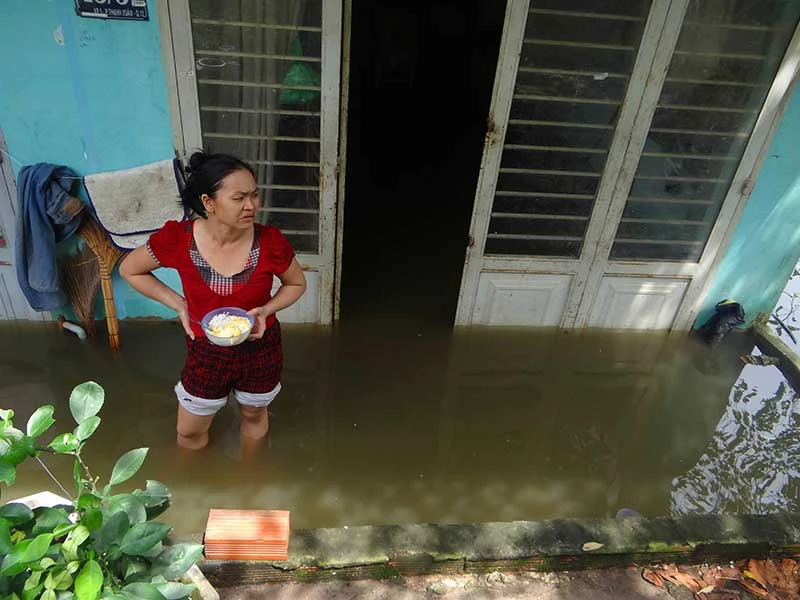Anh Phan Thiên Hưng, nhà ở hẻm 316 quốc lộ 1A, phường Thạnh Xuân, cho biết: “Chiều 12-10, dù trời mưa rất to nhưng nhà tôi không bị nước vào. Tưởng là thoát nạn vì xưa nay khu này chưa bao giờ bị ngập. Nào ngờ lúc 2 giờ khuya 13-10, tôi giật mình dậy thì thấy nước đã vào nhà ngập hơn đầu gối, đồ đạc trong nhà nổi lềnh bềnh trong nước”.