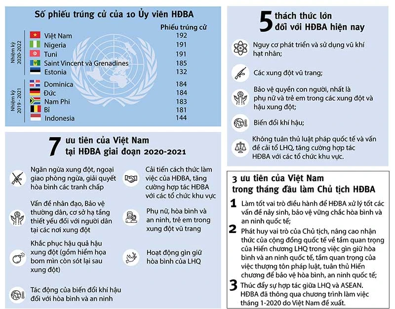 + Giai đoạn 2020-2021 có nhiều thách thức mới. So với 10 năm trước đây, công việc của HĐBA nhiều hơn, phức tạp hơn nhưng mức độ đoàn kết, chia sẻ giữa các nước thành viên lại giảm đi. Bất đồng giữa các nước thành viên trong HĐBA gia tăng, số nghị quyết đạt đồng thuận giảm, các nghị quyết bị phủ quyết và không thông qua tăng lên. Tình hình thế giới tiếp tục diễn biến phức tạp, đặc biệt là các điểm nóng ở Trung Đông, bán đảo Triều Tiên và châu Phi.