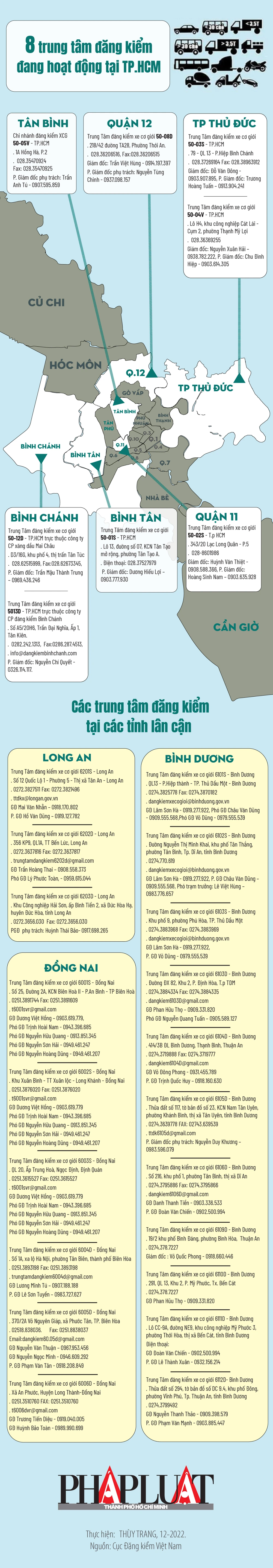 (PLO)- Người dân cần nắm thông tin vị trí 8 trung tâm đăng kiểm đang hoạt động tại TP.HCM và địa chỉ, số điện thoại liên hệ các trung tâm ở các tỉnh lân cận như Long An, Đồng Nai, Bình Dương.