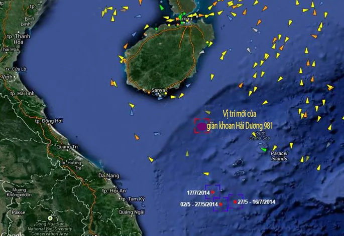 Theo bản đồ trên, các chấm nhỏ màu đỏ phía dưới hiển thị vị trí giàn khoan hạ đặt trong khoảng thời gian từ tháng 5 đến tháng 7 tại biển Đông.
