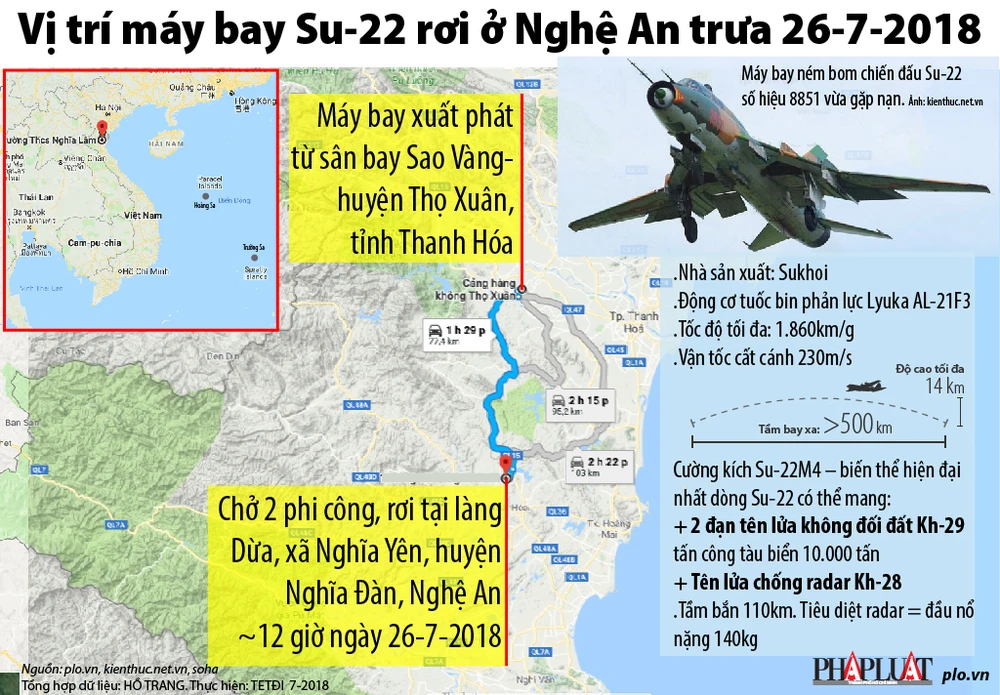 (PLO)- 12 giờ trưa 26-7-2018, trong khi bay huấn luyện chiến đấu, một máy bay phản lực Su-22 đã rơi ở xã Nghĩa Yên, huyện Nghĩa Đàn, Nghệ An. Hai phi công hy sinh là Trung tá Khuất Mạnh Trí, Tham mưu trưởng Trung đoàn 921, Sư đoàn Không quân 371 và Thượng tá Phạm Giang Nam, Chủ nhiệm bay Trung đoàn 921 điều khiển.