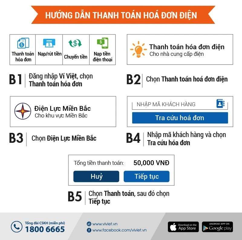 | Các bước thao tác đơn giản trên Ví Việt: Bước 1: Đăng nhập Ví Việt, chọn thanh toán hóa đơn Bước 2: Chọn thanh toán hóa đơn điện Bước 3: Chọn Điện lực miền Bắc Bước 4: Nhập mã khách hàng và chọn tra cứu hóa đơn Bước 5: Chọn thanh toán, sau đó chọn tiếp tục… |
