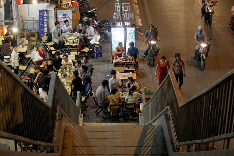 Đêm đến, các quán nhậu trên đường Phạm Văn Đồng (quận Bình Thạnh) tận dụng hết vỉa hè, đẩy người đi bộ xuống lòng đường.