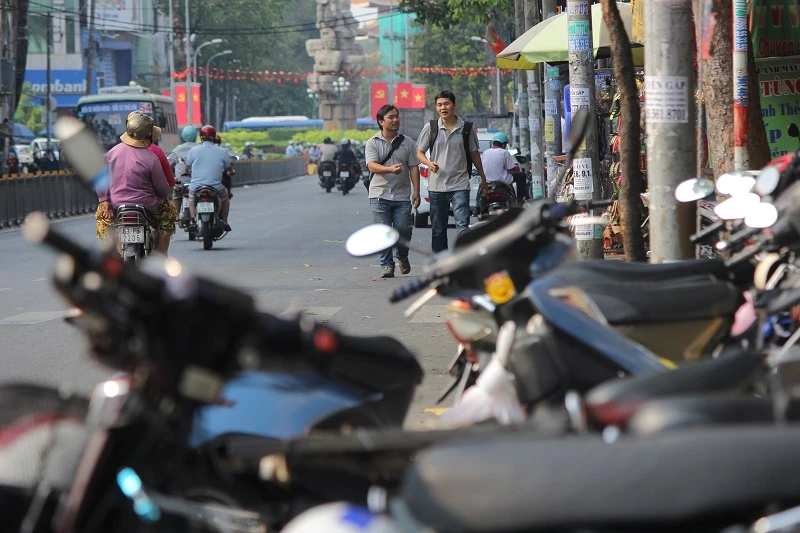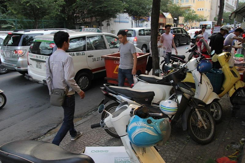 Dọc tuyến đường Hai Bà Trưng (quận 3) xe máy đậu chật kín vỉa hè người đi bộ.