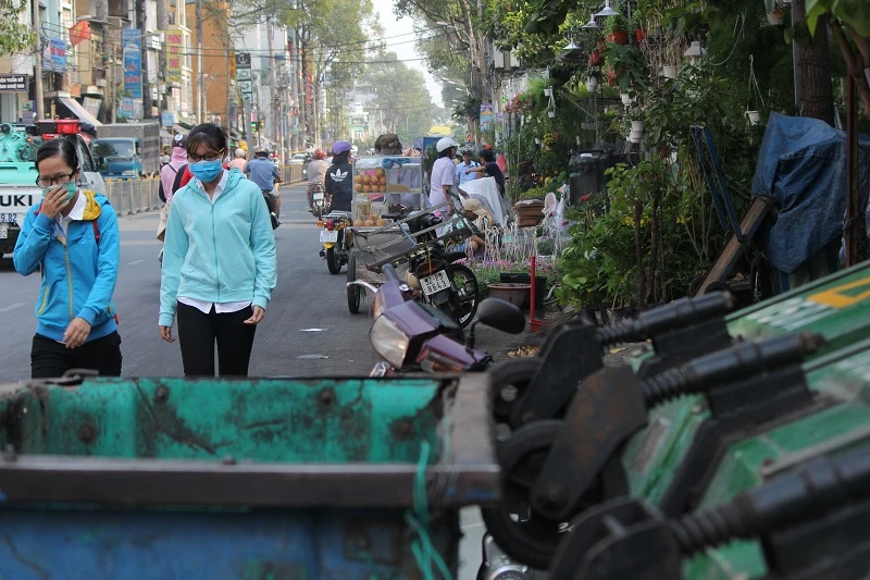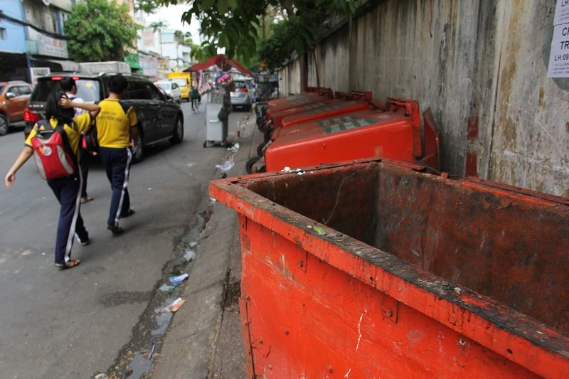 Xe rác tập kết trên vỉa hè, học sinh buộc phải đi dưới lòng đường Lê Bình (quận Tân Bình).