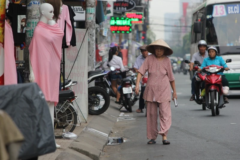 Cụ già đi dưới lòng đường bởi các hộ kinh doanh lấn chiếm vỉa hè trên đường Cách Mạng Tháng Tám (quận Tân Bình).