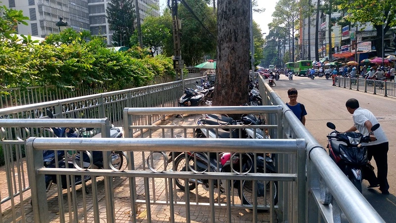 Hơn hai tháng nay, vỉa hè trước BV Chợ Rẫy (đường Nguyễn Chí Thanh và Thuận Kiều, quận 5) được lắp rào chắn rất kiên cố cao 1,3 m để tạo lối đi cho người đi bộ. Tuy nhiên, lối ra vào khó khăn, phần vỉa hè nằm bên trong, mất vệ sinh khiến nhiều người đi bộ chọn cách đi ngay dưới lòng đường.