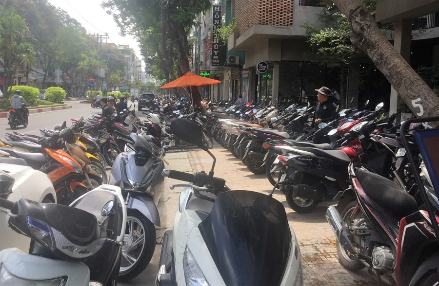 Sáng 19-3, vỉa hè trước quán cà phê The Coffee House ở số 112 Bàu Cát (phường 14, quận Tân Bình, TP.HCM) bị bao chiếm toàn bộ. Lượng xe máy, ô tô của khách vào quán này còn được dựng tràn xuống lòng đường. Ảnh: MP