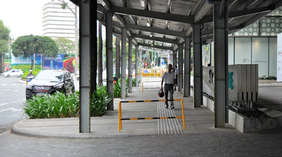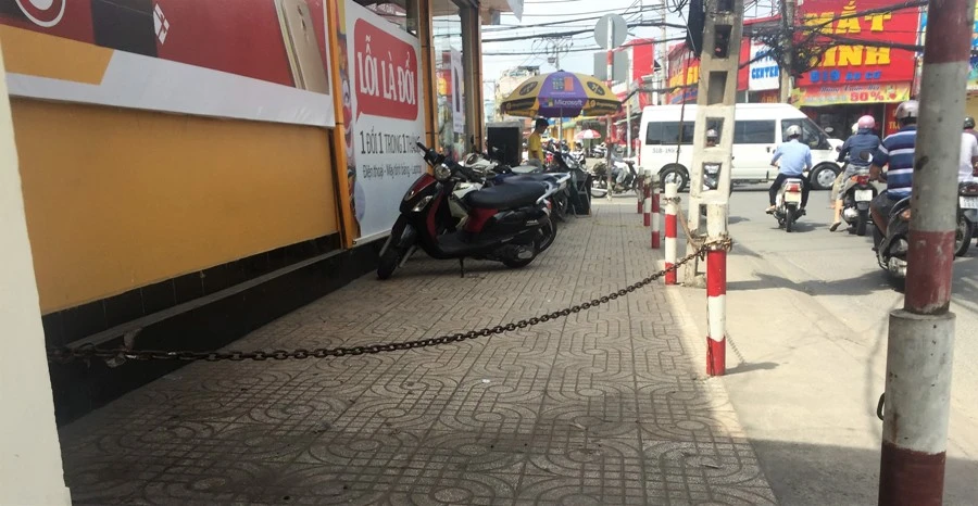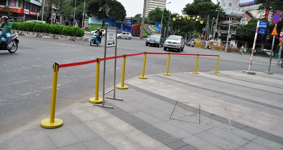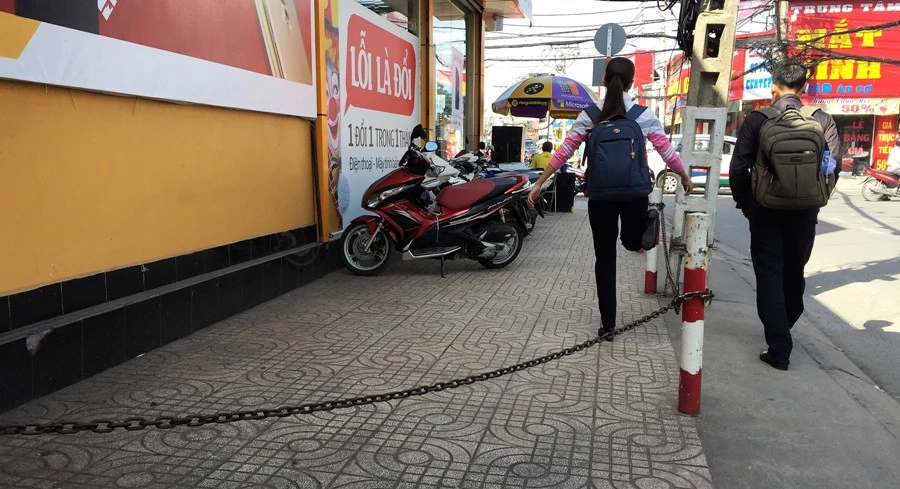 Người đi bộ qua khu vực này khá khó khăn. Những dây xích, cột như thế này ở Ngân hàng Nhà nước Chi nhánh TP.HCM (quận 1) từng bị ông Đoàn Ngọc Hải mạnh tay phá bỏ. Ảnh: MP
