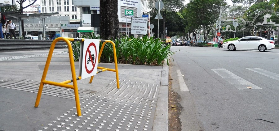 Và chắn lối người đi bộ nhưng vẫn tồn tại, trong khi trước đó, UBND quận 1 từng phản ứng trước việc Sở GTVT cho gắn các barie ngăn xe máy chạy trên một số vỉa hè ở phường Bến Nghé (quận 1). Ảnh: MP