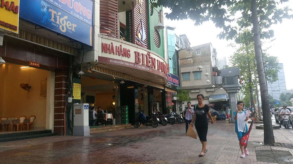 Nhà hàng Biển Dương trên đường Nguyễn Thái Học từng bị đoàn kiểm tra tịch thu bàn ghế, mái che chiếm vỉa hè.