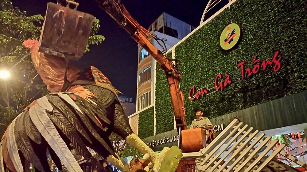 Tối 26-2, nhà hàng Con Gà Trống trên đường Võ Văn Kiệt bị đoàn kiểm tra lập biên bản, tịch thu các chậu cây, cẩu tượng gà phía trước lấn chiếm vỉa hè.
