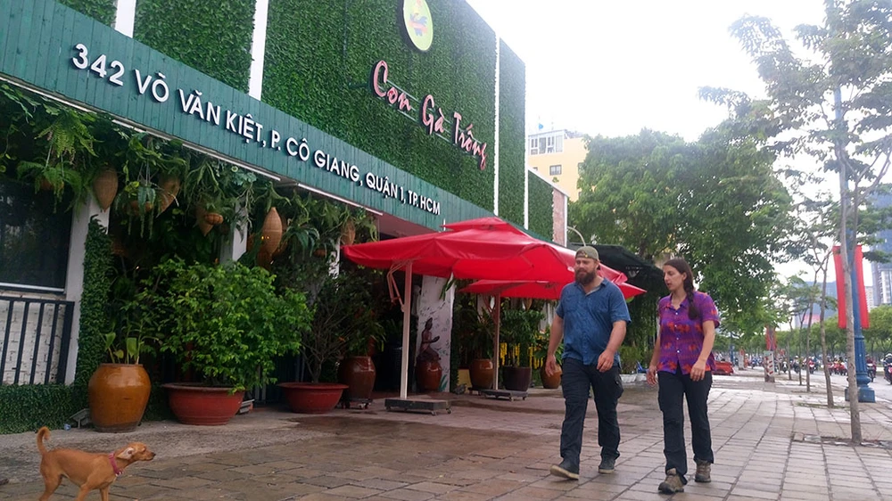 Người đi bộ trên vỉa hè trước nhà hàng Con Gà Trống, chiều 16-5.