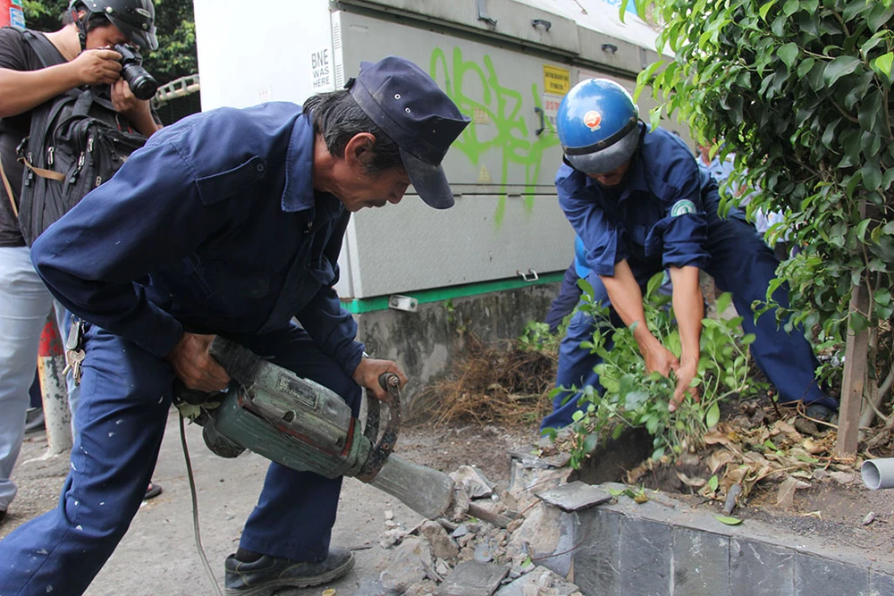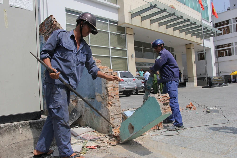 Bồn cây xanh trước Trung tâm Bồi dưỡng Chính trị quận 1 trên đường Nguyễn Trãi xây lấn ra vỉa hè bị phá dỡ ngày 20-2.