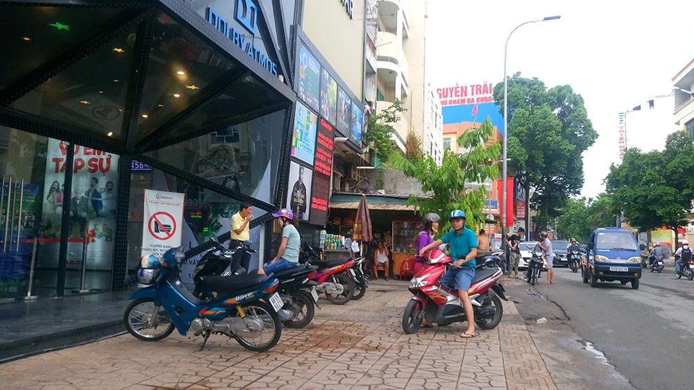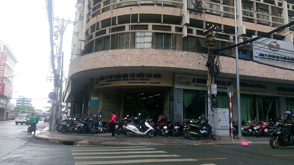 Xe máy đậu chiếm vỉa hè trước trụ sở Công ty Vận tải biển Sài Gòn, chiều 16-5.
