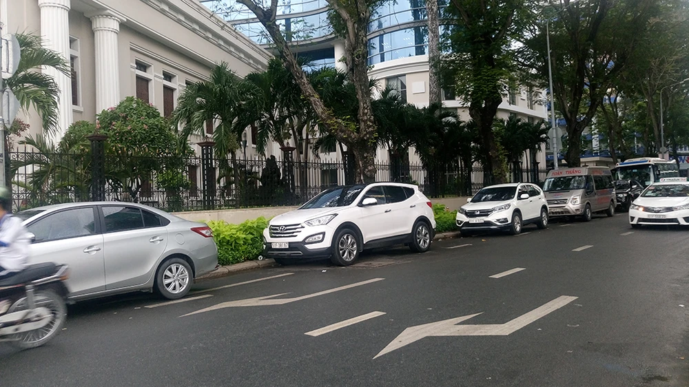 Ô tô đậu chiếm vỉa hè trước trước Sở Giao dịch chứng khoán TP.HCM, chiều 16-5.