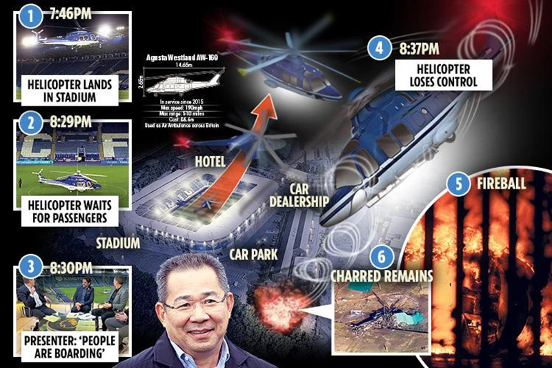 Mốc thời gian cho từng sự kiện trước và sau trận Leicester City-West Ham liên quan máy bay của ông Vichai nổ tung cạnh sân vận động. Đồ họa: Daily Mail (Anh)