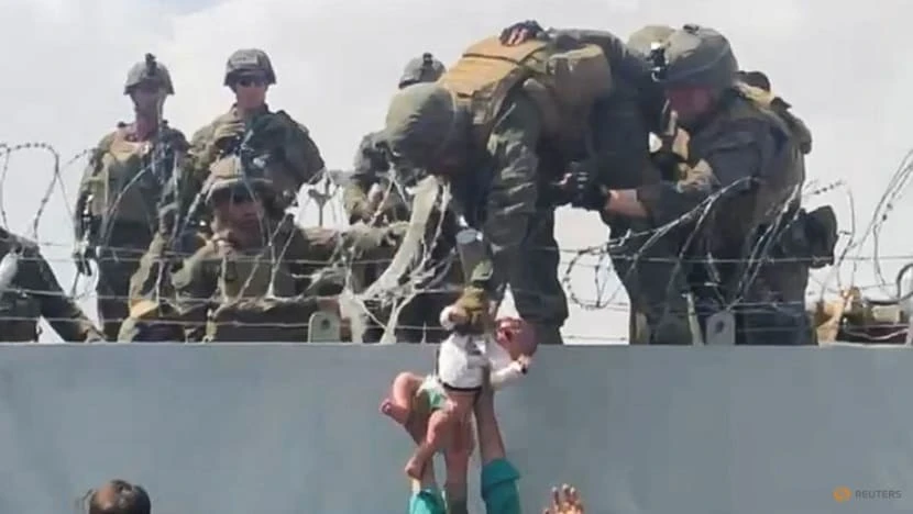 Đoạn video cho thấy cảnh một đứa trẻ tầm vài tháng tuổi, tã bị tuột ra, được một binh sĩ kéo lên cao khỏi đám đông người dân Afghanistan đang tìm cách vào sân bay.