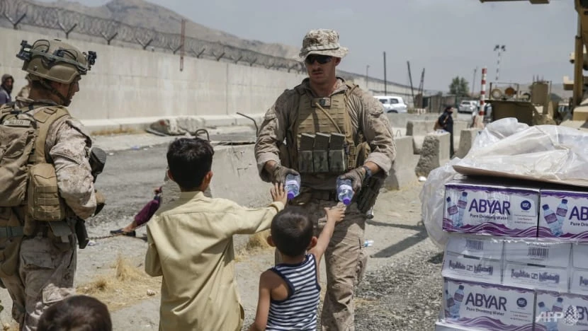 Một binh sĩ Mỹ phát nước cho trẻ em Afghanistan tại sân bay Quốc tế Hamid Karzai ở Kabul vào ngày 8-8. Ảnh: AFP