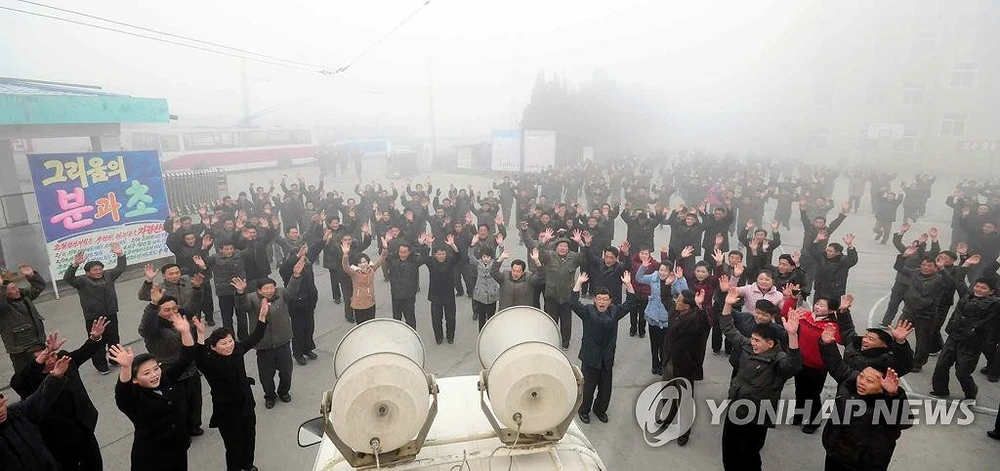 Công nhân Triều Tiên tại một khu khai thác đá vôi giơ tay chào đón nhà lãnh đạo Kim Jong-un trở về. Ảnh: YONHAP NEWS