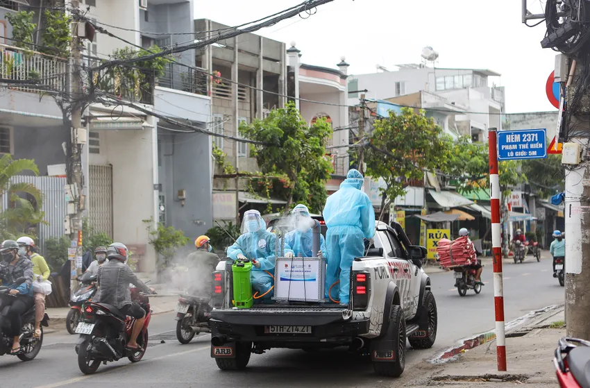 Đội phun khử khuẩn có mặt tại một con hẻm phong tỏa trên đường Phạm Thế Hiển, quận 8, TP.HCM.
