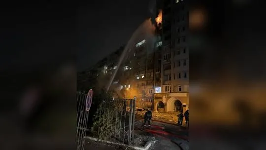 Lực lượng cứu hỏa đang tìm cách dập tắt ngọn lửa bùng lên sau khi mảnh vỡ quả rocket rơi trúng tòa nhà dân cư 9 tầng. Ảnh: TELEGRAM