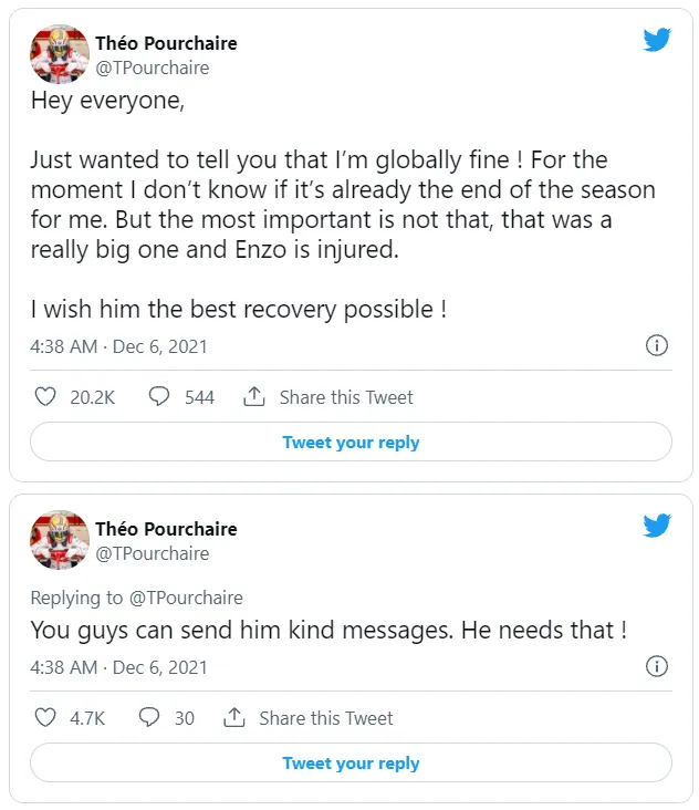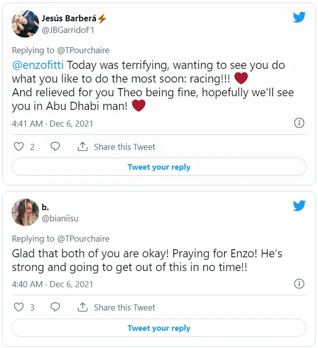 "Nhưng điều quan trọng nhất không phải là việc đó, vụ tai nạn vừa qua là rất nghiêm trọng và Enzo hiện đang bị thương. Tôi chúc anh ấy nhanh chóng bình phục. Các bạn có thể gửi cho anh ấy những lời chúc tốt lành, anh ấy đang cần điều đó đấy” - Pourchaire nói thêm.