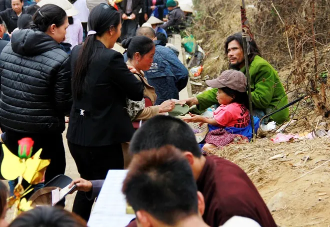 | Chen lấn trong số du khách là sự xuất hiện của rất đông 'Cái bang'. Họ đứng chặn ở khắp các lối ra vào lễ hội. |