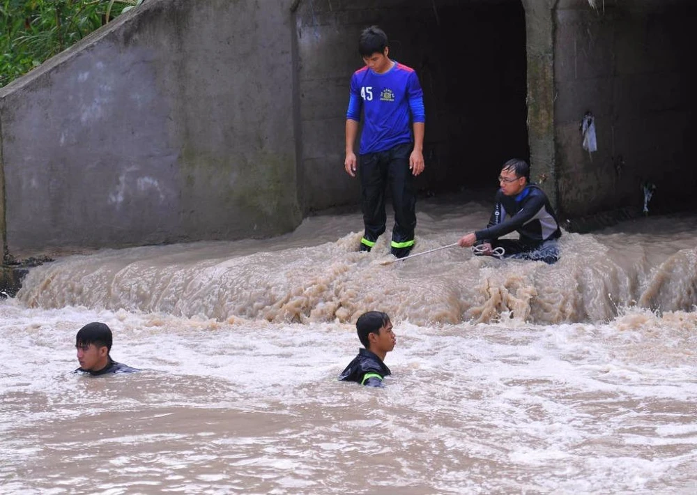Lực lượng chức năng tìm kiếm khu vực miệng cống thoát nước. Ảnh: VH