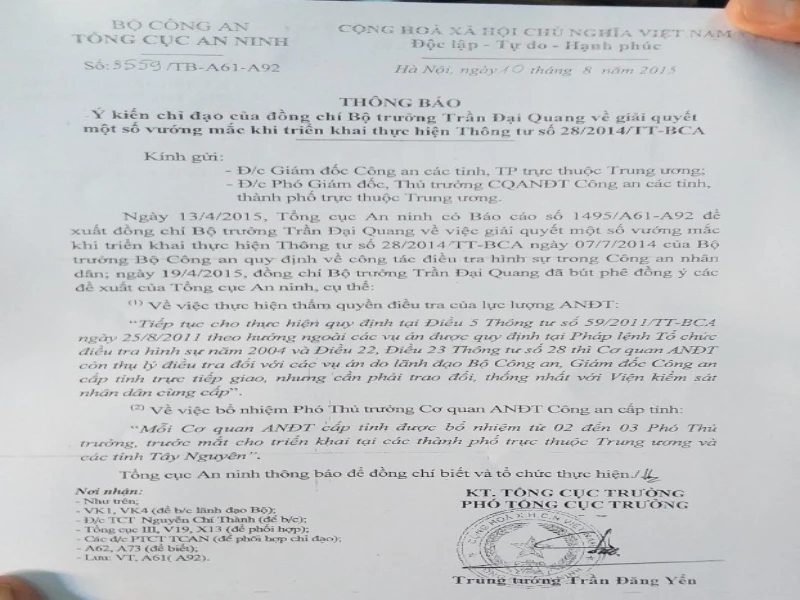 Tuy nhiên, chủ tọa bất ngờ thông báo quay trở lại phần tranh luận vì đại diện VKS vừa cung cấp chứng cứ mới (trong phần tranh luận, VKS không cung cấp được) là Thông báo số 3559/TB-A61-A92, đề ký ngày 10-8-2015 của Tổng cục An Ninh về việc “Ý kiến chỉ đạo của đồng chí Bộ trưởng Bộ Công an Trần Đại Quang về giải quyết một số vướng mắc khi triển khai thực hiện Thông tư số 28/2014/TT-BCA”.