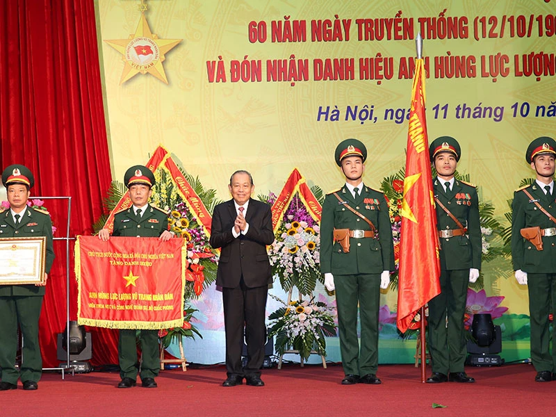 Phó Thủ tướng thường trực Trương Hòa Bình trao danh hiệu Anh hùng lực lượng vũ trang nhân dân của Chủ tịch nước cho đại diện Viện Khoa học và công nghệ quân sự. Ảnh: TTXVN