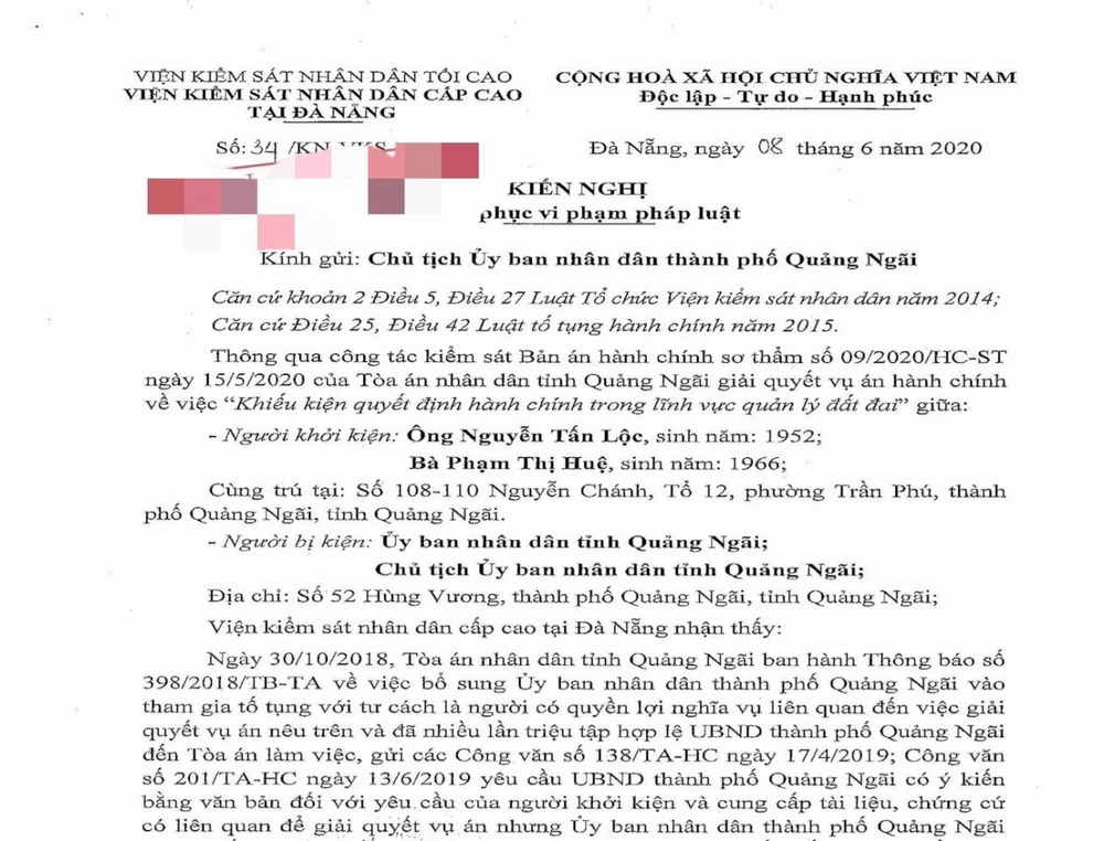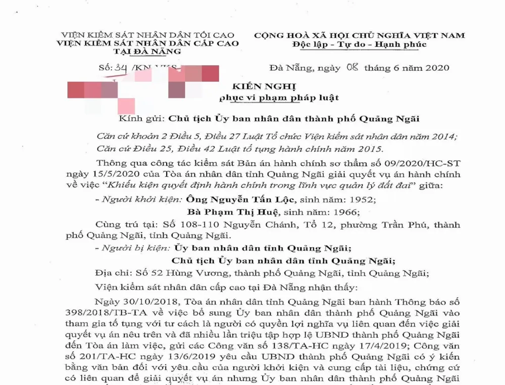 Ngày 8-6, VKSND cấp cao tại Đà Nẵng ra văn bản kiến nghị yêu cầu Chủ tịch UBND TP Quảng Ngãi có biện pháp khắc phục, chấn chỉnh và trả lời cho VKSND cấp cao tại Đà Nẵng biết về kết quả thực hiện kiến nghị trên.