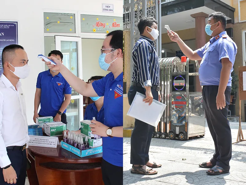 Cục THADS TP.HCM cung cấp miễn phí khẩu trang, nước sát khuẩn cho người dân. Ảnh: CẨM TÚ. VKSND Cấp cao tại TP.HCM đo thân nhiệt cho khách từ ngoài cổng. Ảnh: HUỲNH HOA
