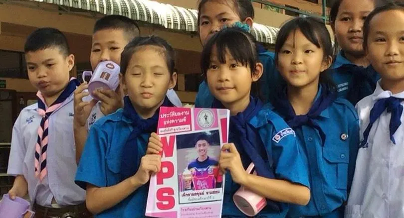 Các học sinh tại trường Ban Wiangphan - nơi Adul theo học giơ một tạp chí in hình Adul khi cậu giành được huy chương trong một cuộc thi. Ảnh: The Nation
