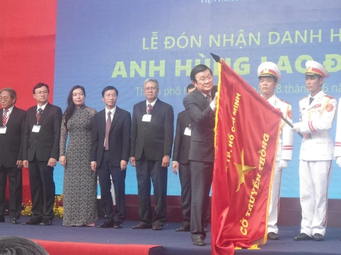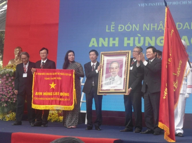 Chủ tịch nước Trương Tấn Sang trao huân chương và danh hiệu anh hùng lao động cho tập thể Viện Pasteur TP.HCM. Ảnh: Hải Âu