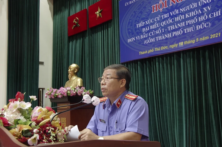 Ông Nguyễn Thanh Sang, Phó Viện trưởng VKSND TP.HCM, trả lời ý kiến của cử tri ngày 18-5. Ảnh: THANH TUYỀN